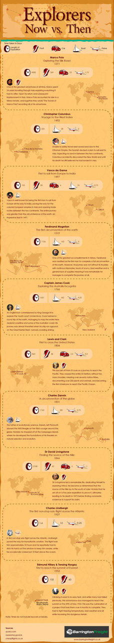 Well, the team here at Barrington thought it would be interesting to ‘explore’ exactly how long it would take to make these journeys in modern times compared to the days of old. From Marco Polo’s great journey on the Silk Road to Christopher Columbus ‘accidentally’ discovering North America, have a look below and see who you would like to follow in the footsteps of.